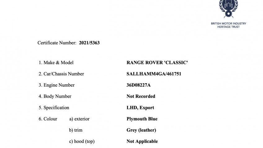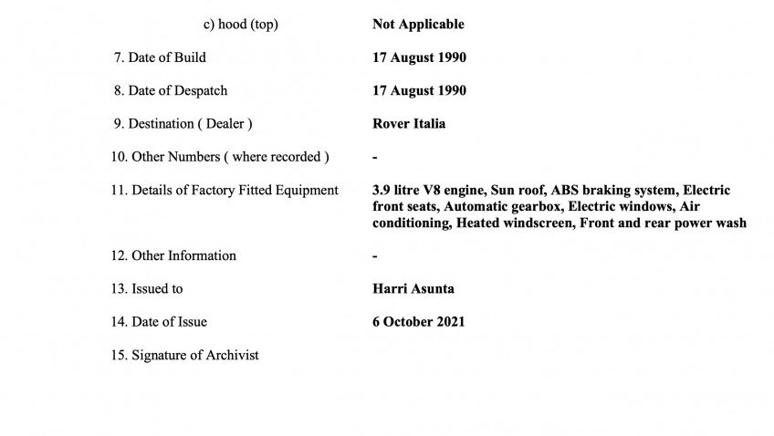 8/1990 date of build, destination Rover Italia